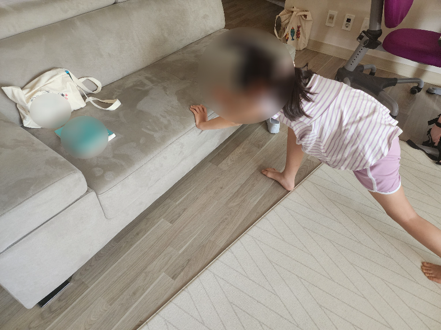 집에 있는 쇼파가 무게가 적게 나가는 것도 아니고 바닥면이 보이게 수직으로 세워놓고 부착했습니다. 다른 쇼파 끝 부분에 부착한 후에 아이보고 밀어 보라고 테스트를 해 보았습니다. 그랬더니 위 사진과 같이 쇼파는 밀리지 않고 바닥에 깔아놓은 파크론 매트가 뒤로 밀렸습니다. 성인 어른이 밀어도 쇼파는 절대 밀리지 않았습니다.