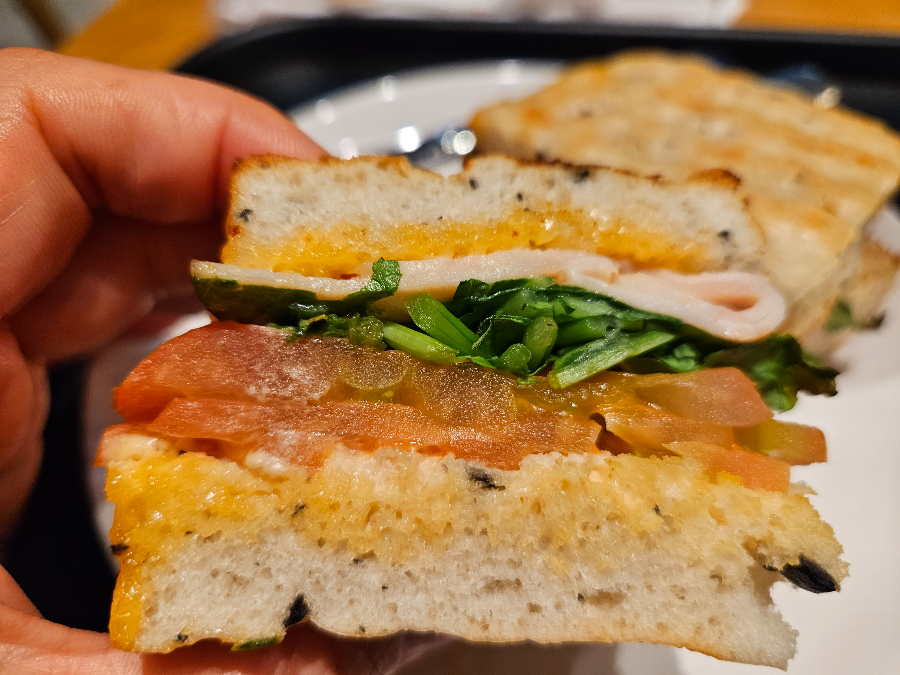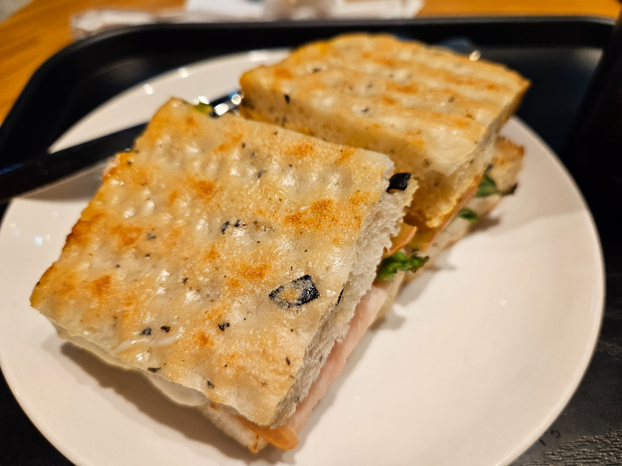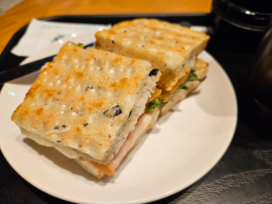 샌드위치를 스타벅스 매장에서 먹으면 샌드위치를 따뜻하게 데워주는데 노릇노릇하게 잘 구워진 샌드위치는 겉은 바삭하고 안은 촉촉해서 더욱 맛있습니다. 담백한 샌드위치 그리고 칼로리가 고민되신다면 햄&루꼴라 올리브 샌드위치를 추천해 드립니다.