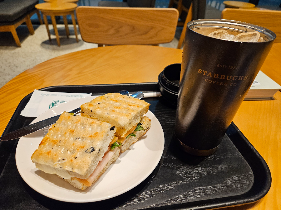 스타벅스를 방문할 예정이 없었는데 스타벅스 앱에서 무료 쿠폰 이벤트 알림이 와서 다녀왔습니다. 커피는 무료이지만 샌드위치를 추가로 주문했으니 결국 저의 지갑에서 돈을 지출하게 되었습니다.