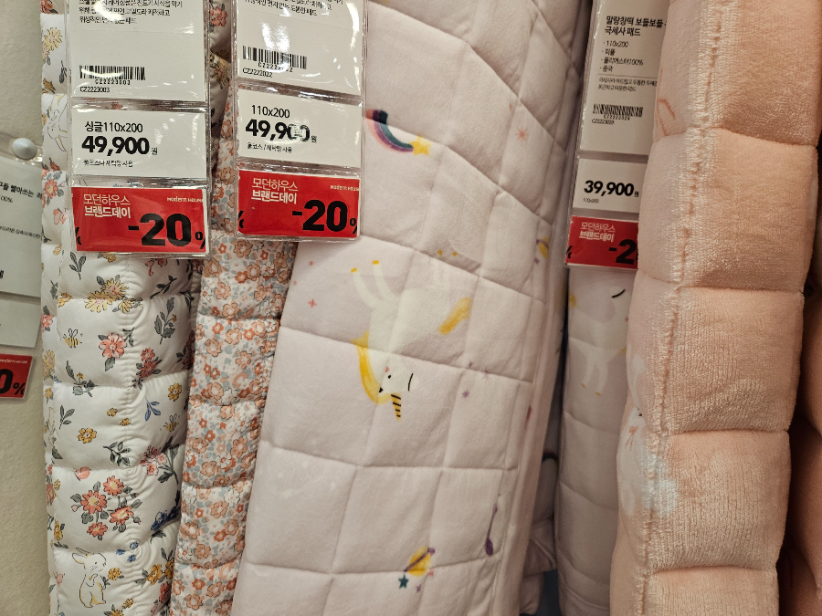 인터넷으로 이불을 구입하고 실패한 경험이 있어서 매장에서 직접 보고 구입하고 싶었습니다. 모던하우스 이불은 가격대비 소재도 좋고 키즈코너가 별도로 마련되어 있어 쇼핑하기 편리합니다.