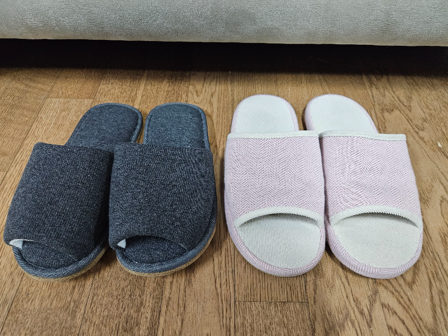 분홍 색상 거실화는 쿠션감이 좋아 보여서 구입했는데 1개월 정도 신다 보니 쿠션감이 사라지고 발바닥에 닿는 부분이 흰색이라 때가 많이 탔습니다. 진회색 거실화는 쿠션감도 살아있고 디자인도 심플해서 마음이 쏙 듭니다.
