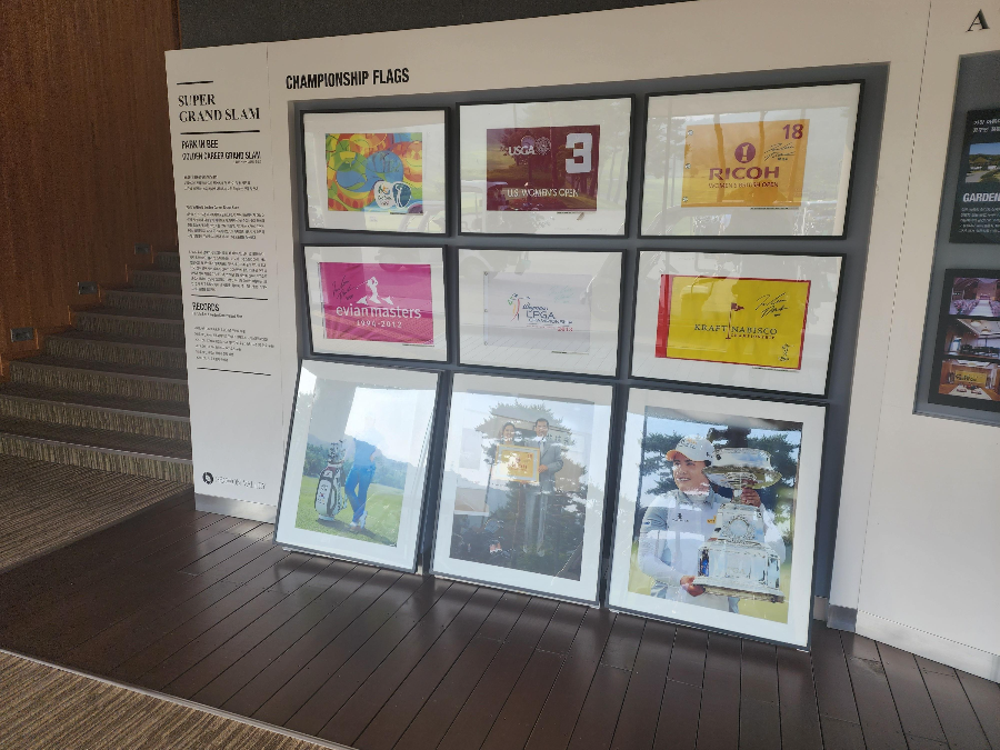 스타트 하우스로 내려가면 LPGA 명예의 전당에 가입된 현역 여자 골프 프로 박인비 선수와 관련된 사진이 전시되어 있습니다. 골프장을 운영하는 회사와 인연이 매우 높은 것 같습니다. 예전에 서원힐스 바로 옆에 있는 회원제 골프장 서원밸리CC에서 라운딩 한 경험이 있는데 거기서는 박인비 프로의 사진을 볼 수 없었습니다. 아마 파주 골프장에서 특정 프로골퍼를 위해 전시해 놓은 곳은 서원힐스cc가 유일한 곳 같습니다.