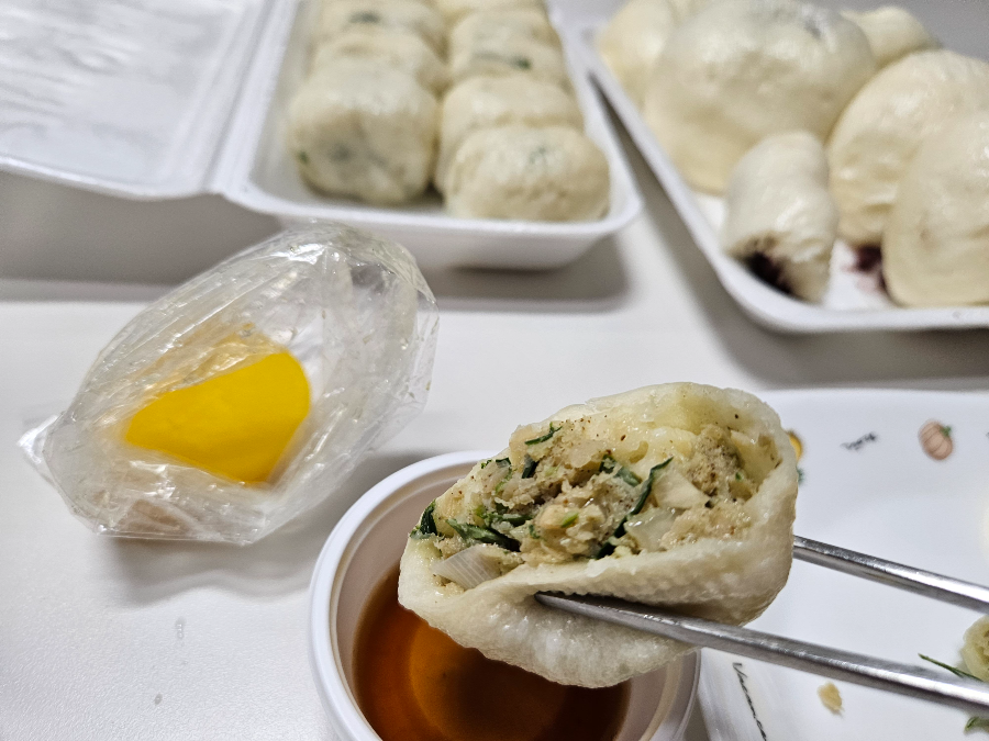 고기만두의 피는 김치만두보다 조금 두꺼운편이고 만두의 속은 야채와 고기가 조화롭게 잘 어울립니다. 담백하고 고기에 잡내 없이 맛있게 먹을 수 있습니다. 특히 고기만두와 찐빵은 아이들 간식으로도 좋습니다.