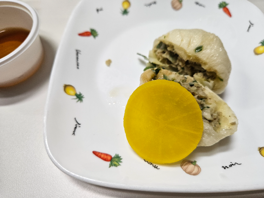 고기만두는 동글동글한 왕만두 모양이고 김치만두는 길쭉한 반달 모양입니다. 찐빵도 생각보다 크고 단무지와 만두간장까지 넣어줍니다. 만두를 간장에 찍어 단무지와 함께 먹으면 더 궁합이 잘 맞습니다.