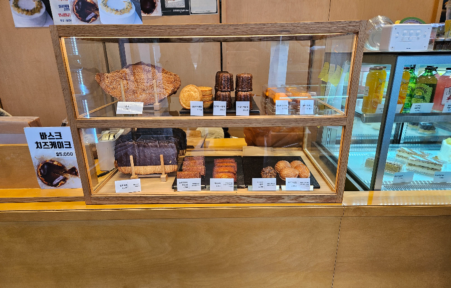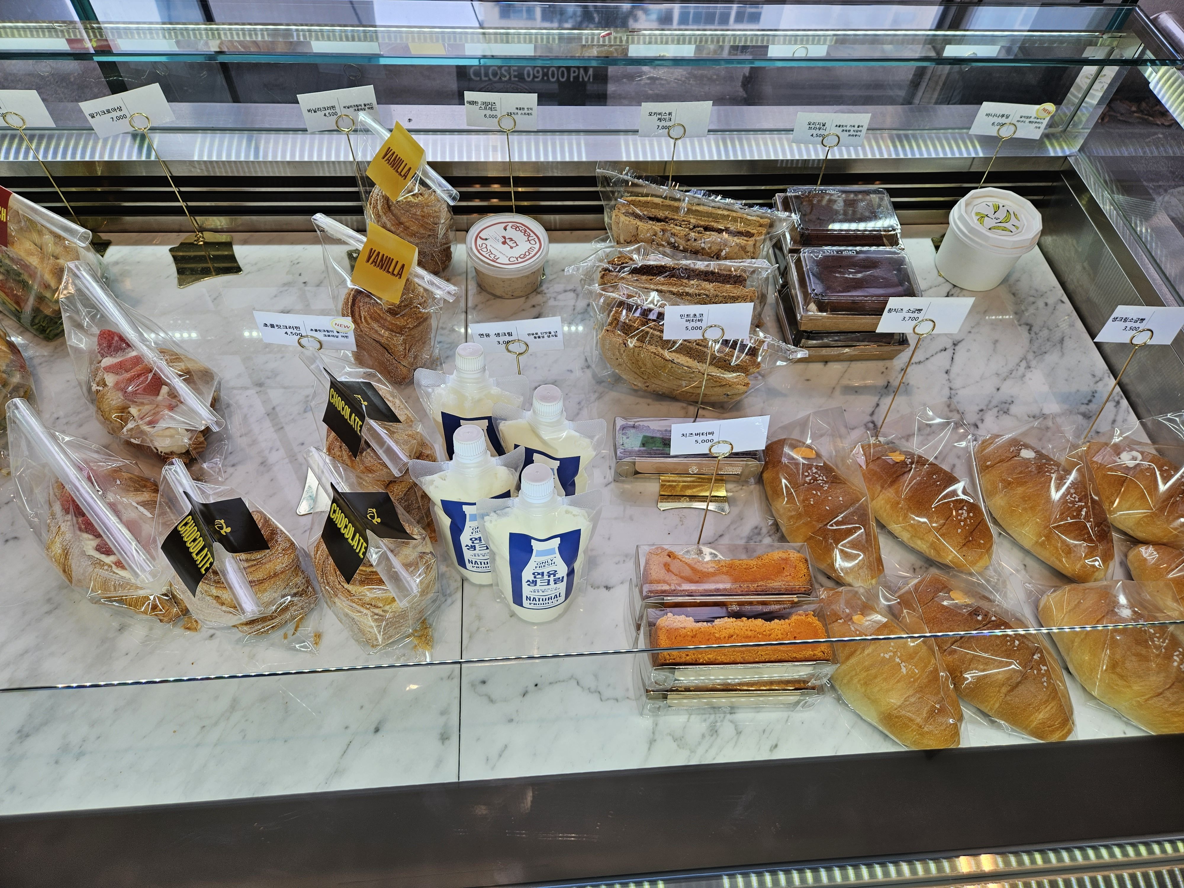 빵 맛집 실리제롬 빵이 깔끔하게 진열되어 있습니다. 요즘 유행하는 크룽지와 빨미까레, 휘낭시에, 레몬 마들렌 등 달콤 가득 디저트들이 있습니다.