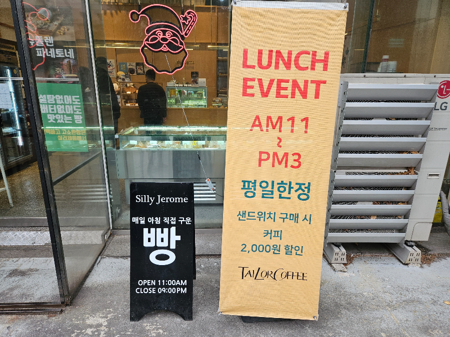 매일 아침 직접 구운 빵을 맛볼 수 있는 실리제롬은 평일 한정 런치 이벤트로 11~15시에 샌드위치 구매 시 커피를 2,000원 할인받을 수 있습니다.