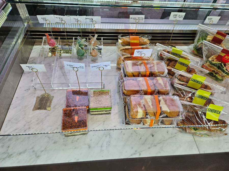 당근케이크와 쑥인절미 케이크는 케이스 안에 담겨 있어 떠먹는 케이크로 당근 모양이 너무 귀여웠습니다. 라즈베리와 바닐라맛 마카롱도 있습니다.