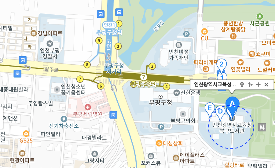 북구도서관의 주소는 인천 부평구 신트리로 21 북구도서관이며, 부평구청역 4번 출구에서 219m 거리에 위치해 있습니다. 부평 구청과 매우 가까워서 찾는데 어렵지 않습니다.