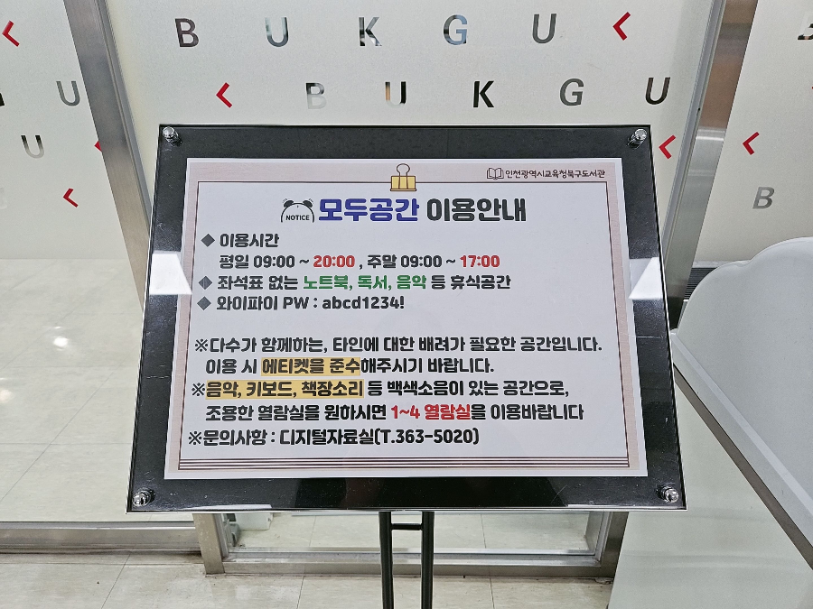 모두공간의 이용시간은 평일 09:00~20:00, 주말 09:00~17:00이며, 좌석표 없는 노트북, 독서, 음악 등 휴식공간으로 이용할 수 있는 공간입니다. 이런 공간이 있는지 처음 알게 되었습니다.