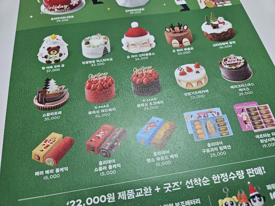 집에서 가까운 파리바게트에서 크리스마스 케이크를 예약했습니다. 파리바게트 크리스마스 케이크 메뉴 중 2023년 선택한 케이크는 12번 블레싱 초코베리입니다. 아이들이 초콜릿케이크와 딸기를 좋아하는데, 초코와 딸기가 모두 포함되어 있어 예약해 보았습니다. 매장내에 파리바게트 크리스마스 케이크가 아직 진열되어 있지 않아서 직접 케이크를 볼 수는 없었습니다. 케이크를 수령하고 다시 리뷰해 보겠습니다.