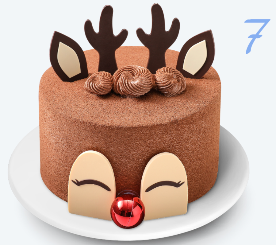 웃고 있는 빨간 코가 매력적인 귀여운 루돌프 모양의 케이크로, 진한 초코 시트와 초코 크림, 초코 크런치가 어우러진 케이크입니다. 가격은 32,000원이며, 10% 할인가는 28,800원입니다.