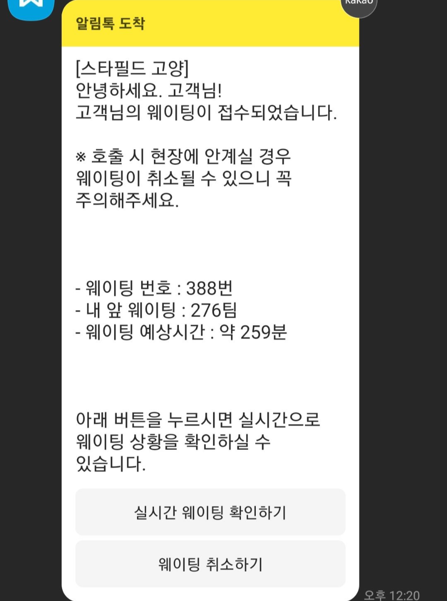 웨이팅 접수는 현장에서만 접수가 가능하며, 접수 후 카카오톡을 통해 입장 알림을 받아볼 수 있습니다. 주말 일요일 12시 20분에 도착을 했고 내 앞 웨이팅은 276팀이었습니다. 276팀은 가족 단위이기 때문에 생각보다 시간이 오래 걸렸습니다.