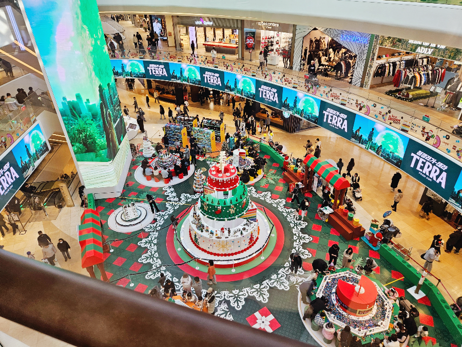 크리스마스 대형 케이크가 가장 중앙에 위치해 있는 알록달록 색깔에 레고 케이크는 어른이 보기에도 웅장하고 이렇게 큰 레고를 만들었다는 것이 신기하게 느껴졌습니다. 케이크 위에는 크리스마스를 상징하는 레고 작품들이 전시되어 있었습니다.