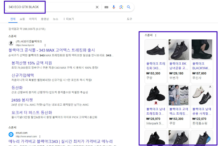 블랙야크 트래킹화 모델은 343 ECO GTX 입니다. 제가 구입한 가격 태그에는 약 22만원으로 표시되어 있습니다. 인터넷으로 해당 제품을 검색하여 보면 12만원대에서 15만원대에 이르기까지 다양한 가격대가 구성되어 있습니다. 판매되는 쇼핑몰에 따라서 미보유 사이즈가 있어 확인 후에 저렴한 가격대를 선택하시면 되겠습니다.