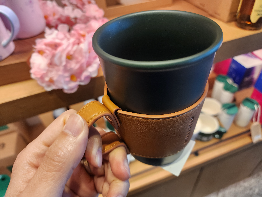 텀블러가 아닌 컴제품의 경우에는 가격이 좀 더 저렴합니다. 이번에 특이하게 구성된 제품을 처음 보았습니다. 가죽과 도자기로 소재로 구성된 컵입니다. 손잡이와 도자기 컵과 걸쳐지는 부분은 위 중앙 사진과 같이 되어 있고 컵을 사용을 세척할 때는 분리하여 깨끗하게 세척이 가능합니다. 가죽의 따뜻함과 빈티지 느낌이 도자기 컵과 아주 잘 매치됩니다. 이 컵의 경우 가격이 18,000원입니다.