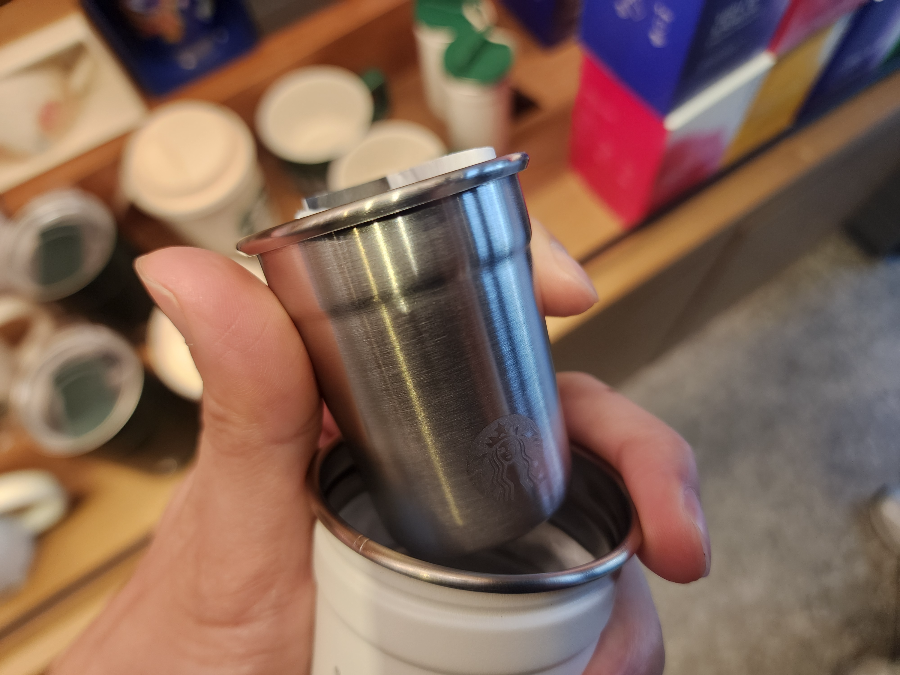 위 사진과 같이 미니 스텐 컵 하단에 스타벅스 로고가 새겨져 있습니다. 정말 소주잔 용도를 고려하여 나왔는지 궁금합니다. 잔 내용물이 얼마큼 남아 있는지 보이지 않아 혼술을 즐기거나 각자 따라 마실 때는 괜찮을 것 같습니다.