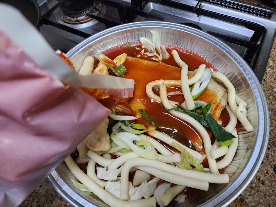 앞서 밀키트 제품 구성에서 언급하였듯이 냄배째로 조리를 하는 것이라 방법이 정말 단순합니다. 액체로 된 소스를 냄비에 다 부은 후에 끓이면 매콤달달 어메이징 떡볶이가 완성됩니다. 냄비 면적이 넓어 보여서 소스가 양이 적지 않나 생각될 수 있습니다. 제가 조리해 본 결과 딱 맞았습니다.