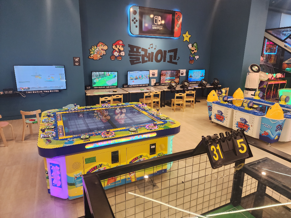닌텐도 스위치, 소니 플레이스테이션, 낚시게임, 농구, 축구, 에어하키, 슈팅게임 등 아이들과 함께 오는 성인 분들도 함께 즐겁게 즐길 수 있는 게임이 많습니다.