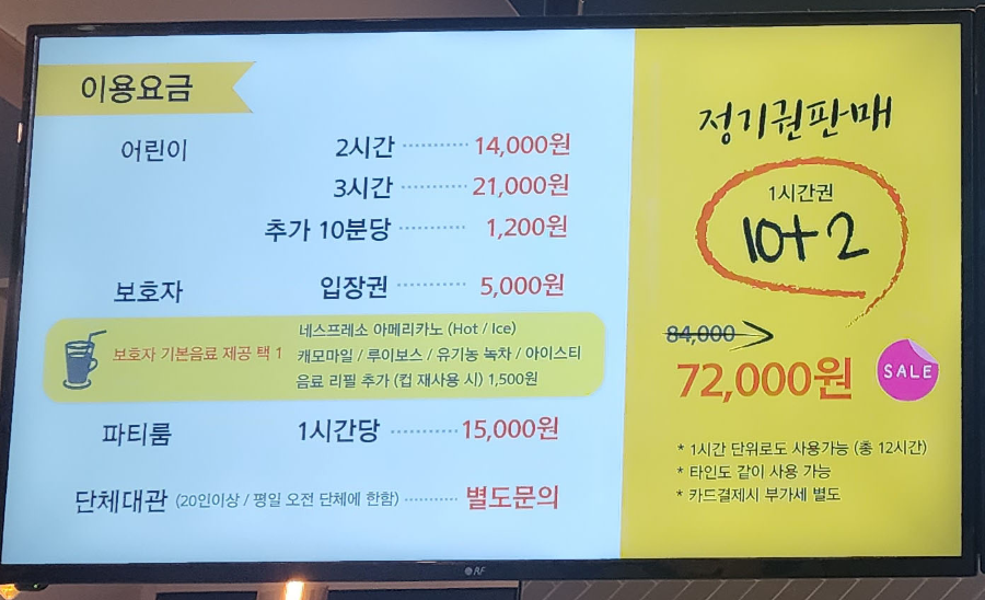 청라 키즈카페 플레이고 이용요금은 시설 및 공간 구성만큼이나 다양하게 구성되어 있습니다. 어린이는 2시간에 14,000원과 3시간 21,000원이며 함께 입장하는 보호자는 입장료는 5,000원 입니다. 그 외에도 생일 파티가 가능한 파티룸은 시간당 15,000원 별도 이용료를 냅니다. 자주 애용하면 12시간 이용권을 74.000원에 구매할 수 있습니다. 시간단위로 나눠 사용이 가능합니다.