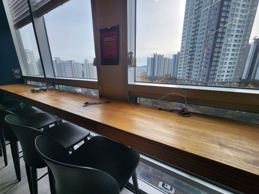 플레이고를 들어가 보호자 분들이 휴식을 취할 수 있는 곳에서 창문을 보면 청라엑슬루타워 아파트가 시원스럽게 눈 안에 들어옵니다.