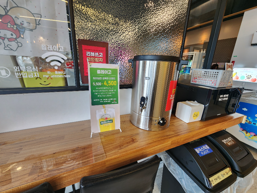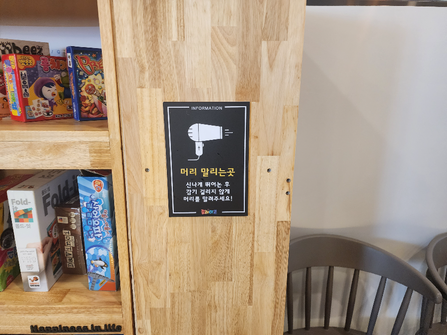 플레이고 청라 키즈카페는 음식을 판매하는 작은 편의점이라고 생각하셔도 되겠습니다. 가격적인 면에서는 저렴한 편은 아니지만 이용하는 편의성 측면에서는 장점이 있습니다. 그리고 땀나게 놀다 보면 머리가 젖어 있어 감기가 걸릴 수 있습니다. 예방하기 위해 머리 말리는 곳도 마련되어 있습니다.