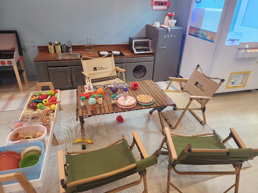 전자 게임에 흥미가 없거나 잘 하지 못하는 유아나유치원생들을 위해 손으로 가지고 놀 수 있는 장난감도 있습니다. 식탁, 의자 등이 갖춰져 있어 소꿉놀이를 할 수 있는 공간이라고 생각하시면 되겠습니다.