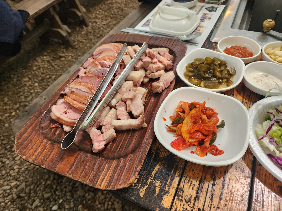 식당에 들어가서 놀란 것은 넓은 식당입니다. 처음에는 주차장이 왜 이렇게 많은 것인지 이상하게 생각했는데 식당 안을 들어와 보니 왜 그런지 알게 되었습니다. 식당 규모와 비교하여 주차장이 좁게 느껴졌습니다. 그리고 옛골토성의 트래드 마크인 참나무 장작 바베큐가 돌아가는 것이 재미있었습니다. 보통 원형이 아니라 네모난 모양의 수평 형태의 바베큐는 많이 보았는데 여기처럼 원형으로 돌아가는 모습은 처음 보았습니다.