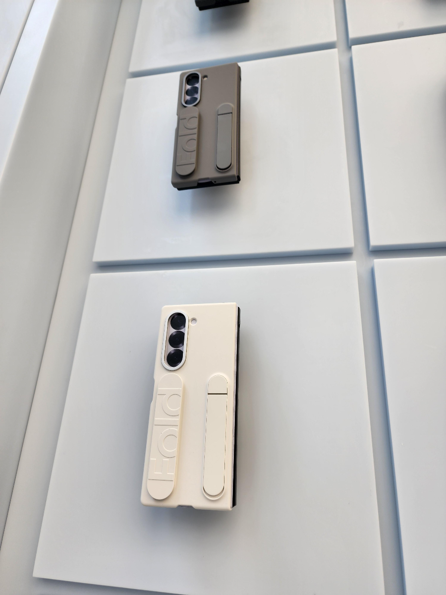 벽면에 자석으로 붙어 있습니다. 붙어있는 케이스를 손에 쥐고 가볍게 당기면 벽면에서 떨어져서 위 사진과 같이 그립감을 체험해 볼 수 있습니다. 케이스 뒷면에는 가격표가 붙어 있습니다. 가격을 보고 깜짝 놀랐습니다. Z폴드6 기준으로 5만원대였습니다. 개인적으로 약간 부담되는 가격입니다. 그래서 저는 출시되었을 때는 정품 케이스를 사용하지 않고 1 ~ 2년 시간이 지나 저렴해질 때 정품 케이스를 구입합니다.