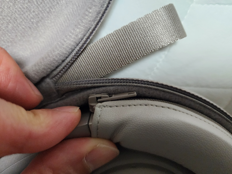 깔끔하게 헤어밴드 중앙 상단 부분이 맞춰져서 지퍼를 닫았습니다. 색상도 소니헤드셋 기존 색상과 동일하여 전혀 이질감이 나지 않고 잘 어울립니다.