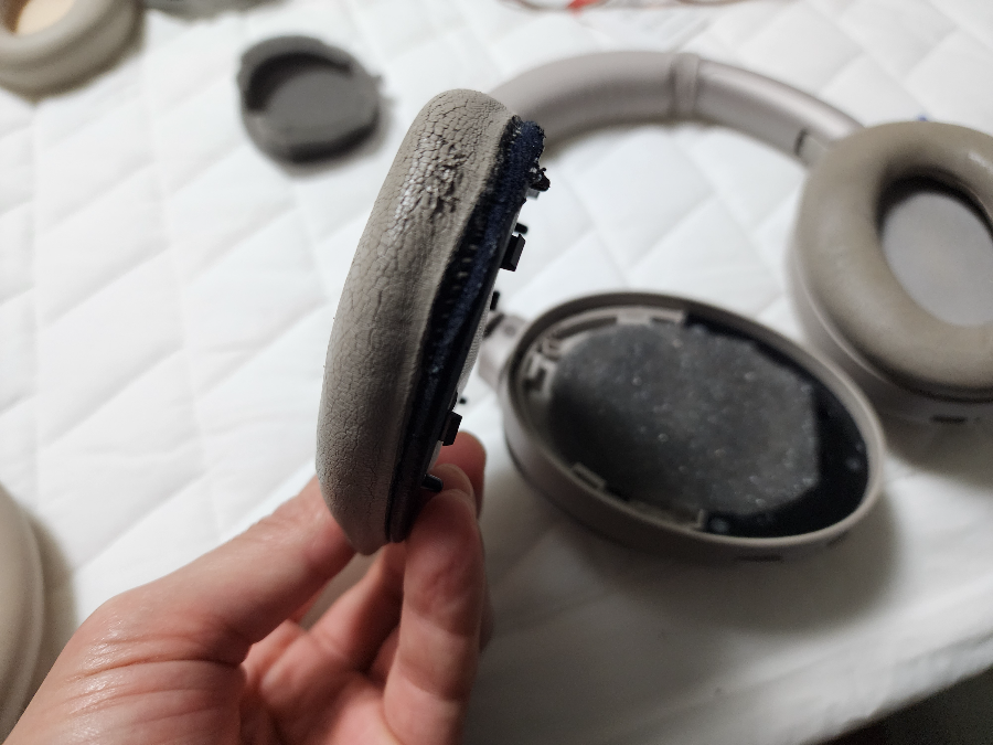 약 5년 전에 거금 약 30만을 들여 소니헤드셋을 구매했습니다. 처음 구매하는 헤드셋이었는데 과감하게 30만원을 투자했습니다. 자주 사용은 아니지만 가끔씩 사용해도 아래 사진과 같이 이어패드 부분이 갈라지고 해져서 교체가 필요했습니다.